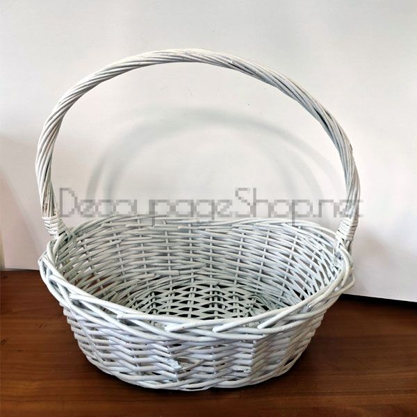 Изработена от ратан в бял цвят. Кошницата е подходяща за цветя или за съхранение на различни продукти.