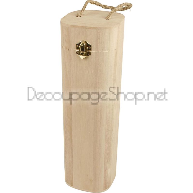 Кутия за вино от дърво с пантичка, метална закопчалка на капачето и дръжка от конопено въже с размери 10 х 10 cm и височина 34 cm.