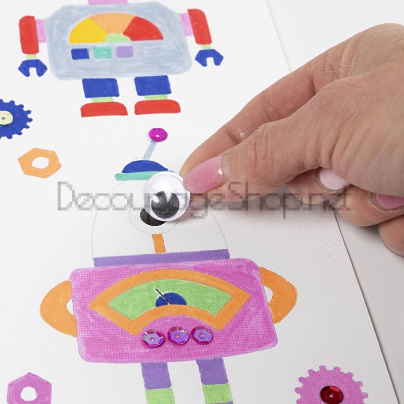 Използвайте самозалепващите се очи върху всякакви повърхности като картон, хартия, памучни тампони, картон, помпони, фигурки от копринена глина и др.