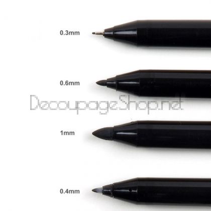 съдържа: тънкописец 03 екстра фин, 04 с устойчив пластмасов връх; маркер 06 заоблен връх и 10 широк връх (цифрите указват диаметъра на писеца)