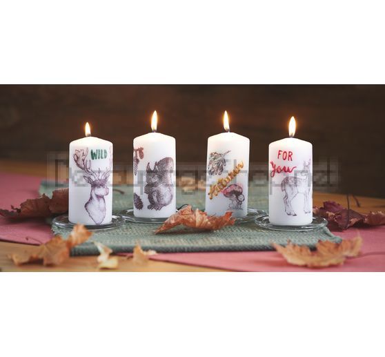 За направата на декупаж върху свещи: нанесете тънък слой лепило на мястото, където искате да поставите мотива, махнете задния слой на салфетката, поставете мотива върху свеща.